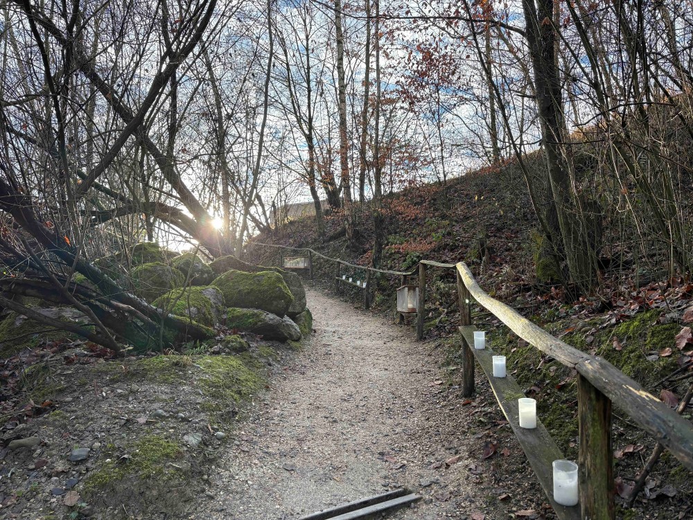 Gerade in der Adventszeit bietet sich auf einem Teil des Rontaler Höhenweges ein besonderes Highlight: Er führt entlang des Lichterweges Gisikon. Hunderte von Laternen und Kerzen werden täglich angezündet und viele weihnachtliche Holzfiguren zieren den Weg. Der Weiher Richtung KneippGarten ist so besonders mystisch. Und auch ein Halt im KneippGarten lohnt sich. Wer traut sich, bei kühlen Temperaturen die Schuhe auszuziehen und eine Runde barfuss durch den Garten zu spazieren?
